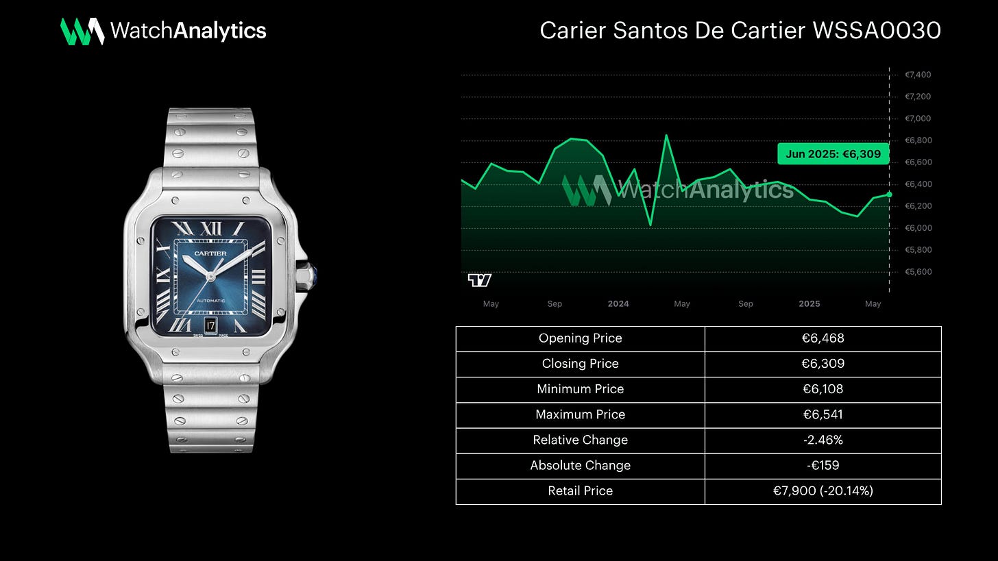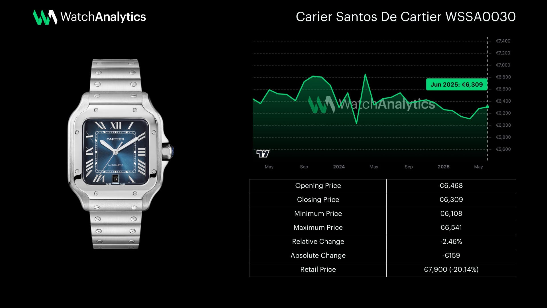 As of June 2025, the Cartier Santos WSSA0030 is trading at an average of €6,309. One year ago, the watch opened the observed period with a value of €6,468, which corresponds to a modest decline of -2.46%, or €159 in absolute terms.