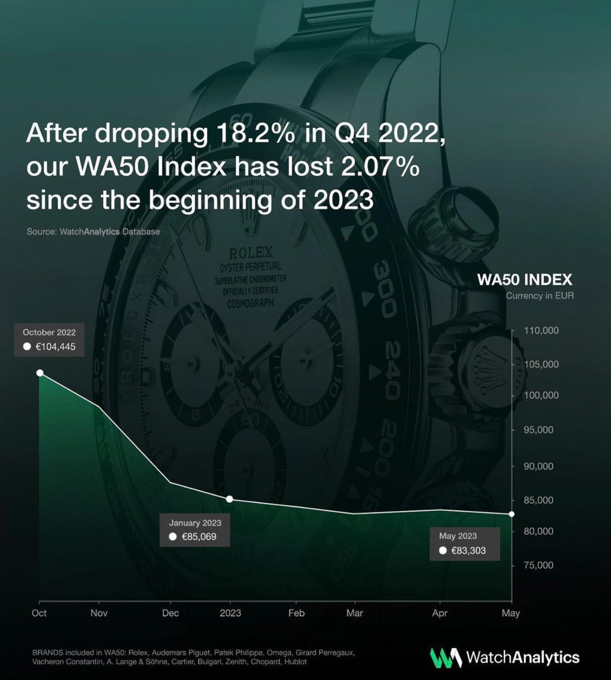It is interesting to note that the percentage loss with which the WA50 closed 2022 is almost the same as that of the PatekPhilippe35. This figure highlights the very strong link that exists between the general market performance and the performance of Patek Philippe.