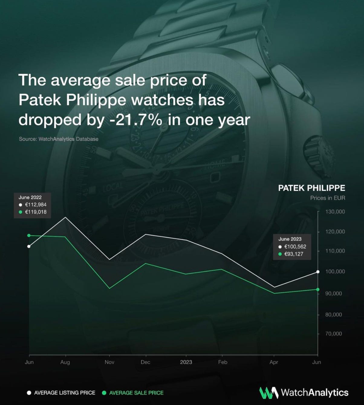 Analyzing the Patek data through another perspective in this chart we compare the average price of listings, all the listings that are posted, with the average price of sales, all the prices at which the watch is sold.