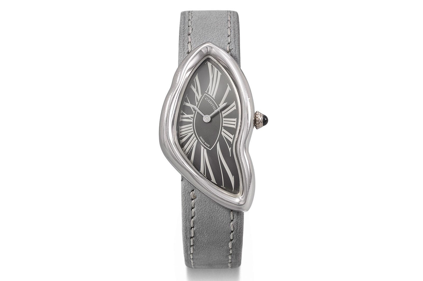 One of the most talked-about pieces was the Cartier Crash sold at Christie’s, a true icon of the maison. This example is likely a one-off, produced through Cartier’s New Special Order program, which allows loyal clients to customize materials and design elements, within strict limits. In this case, the buyer chose a white gold case paired with a grey galvanic dial, called “Nickelé,” featuring warm-toned Roman numerals in a dramatic “exploded” layout. The original design, dated May 6, 2021, required over 10 months of production.