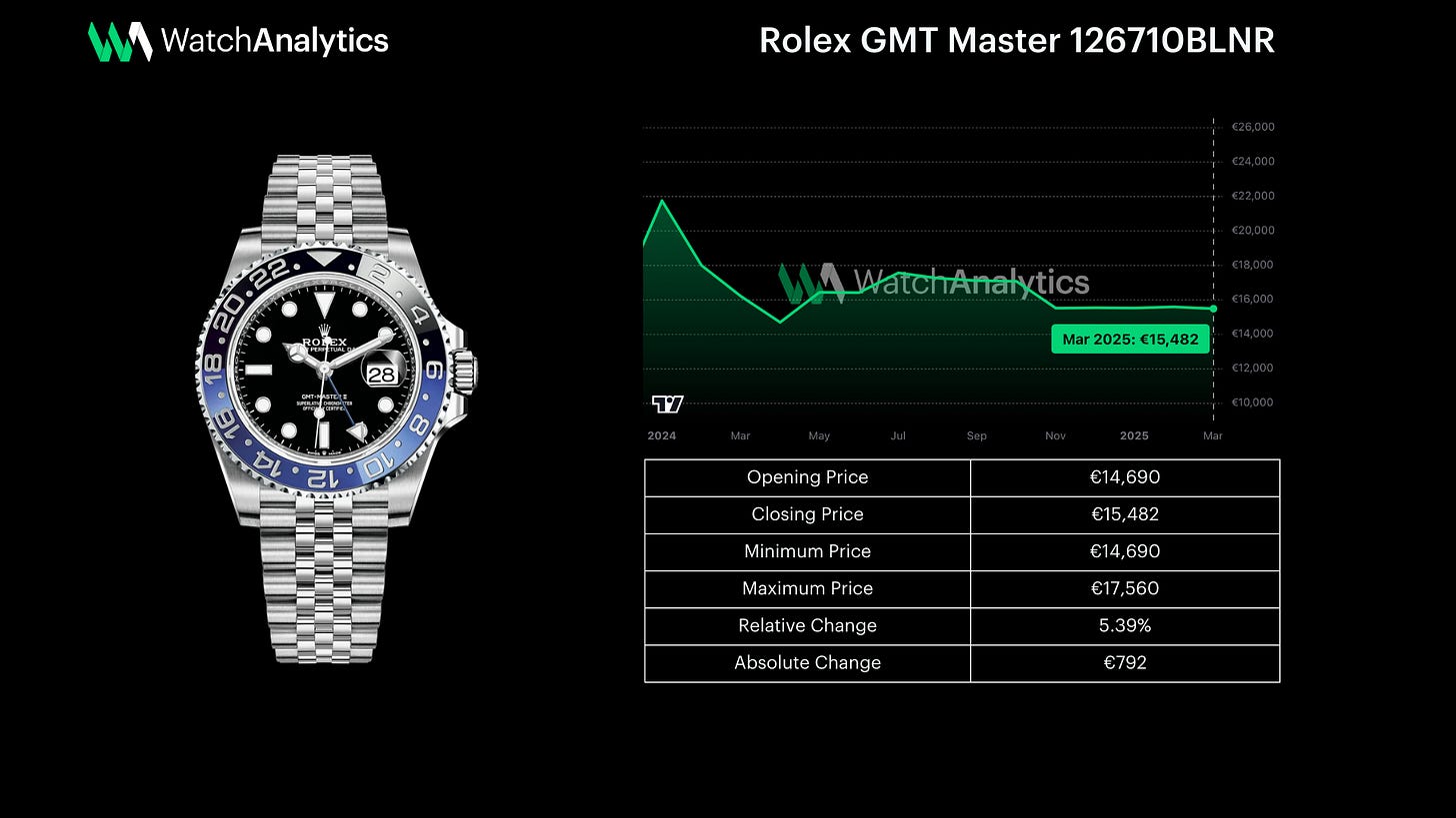 Analysis of the GMT-Master II market, with a focus on the Pepsi and Batgirl, clearly shows how speculation, expectations about Rolex novelties, and fluctuations in supply and demand affect the value of these models. Pepsi, after the euphoria of 2024, has undergone a major correction, while Batgirl has shown more stability. Anticipation for Watches & Wonders 2025 and the possible release of new references for the 70th anniversary of the GMT-Master could lead to new changes in the market. In the coming months, it will be crucial to monitor price and sales developments to understand whether there will be further corrections or new growth in interest in these iconic models.