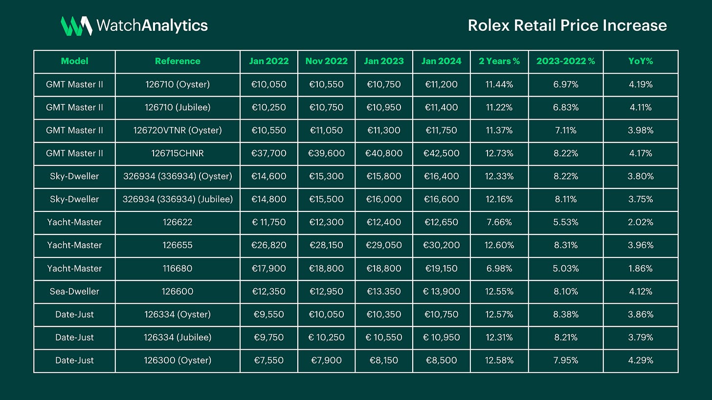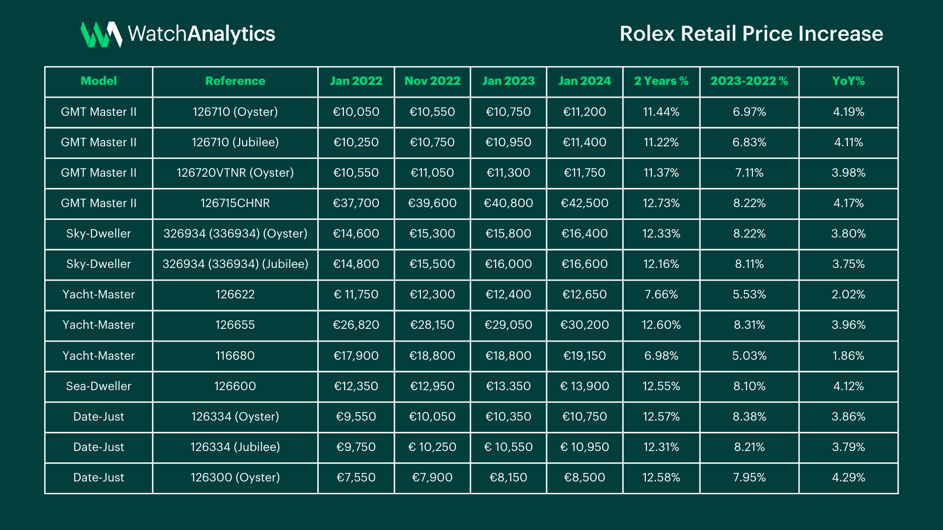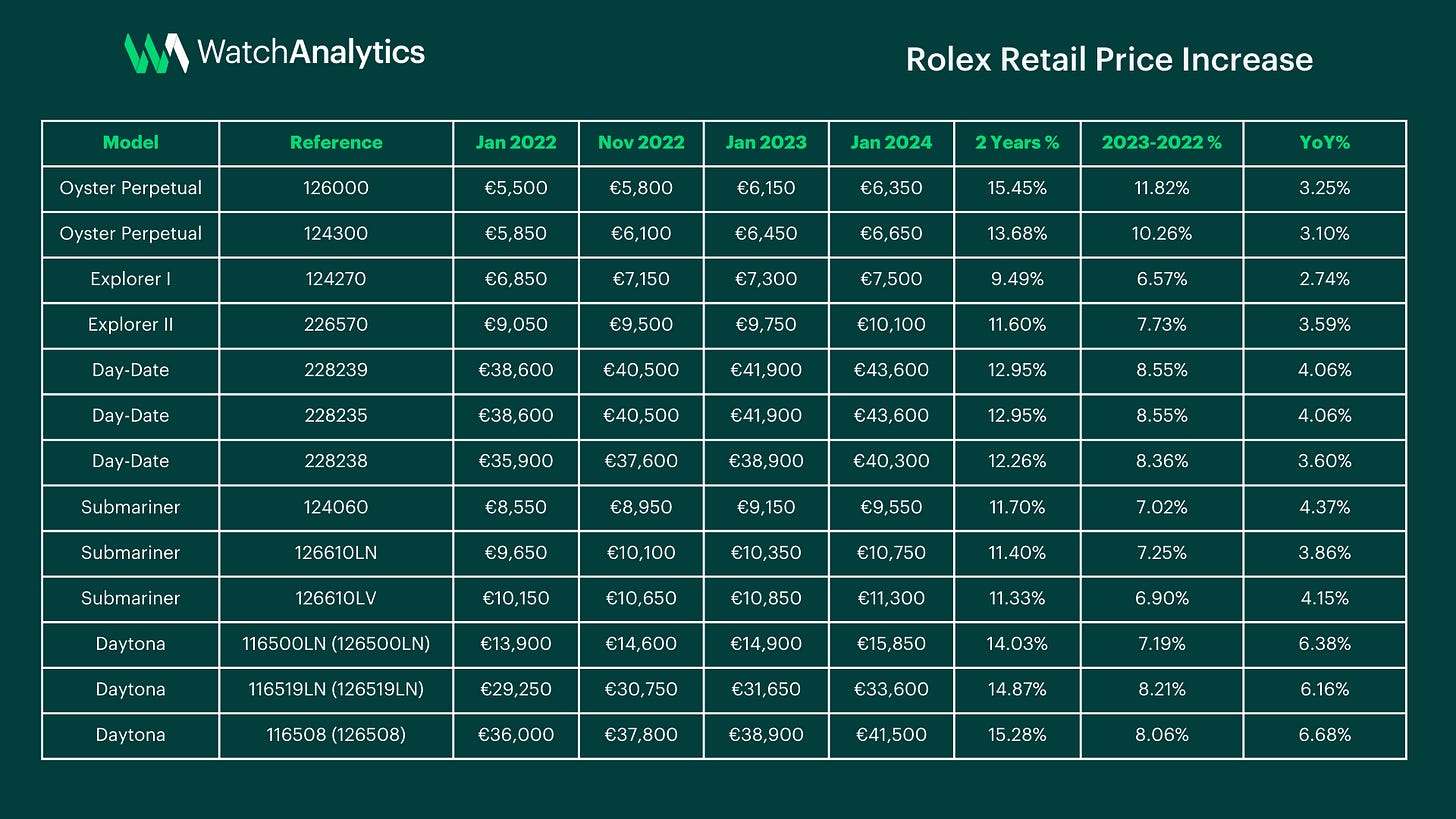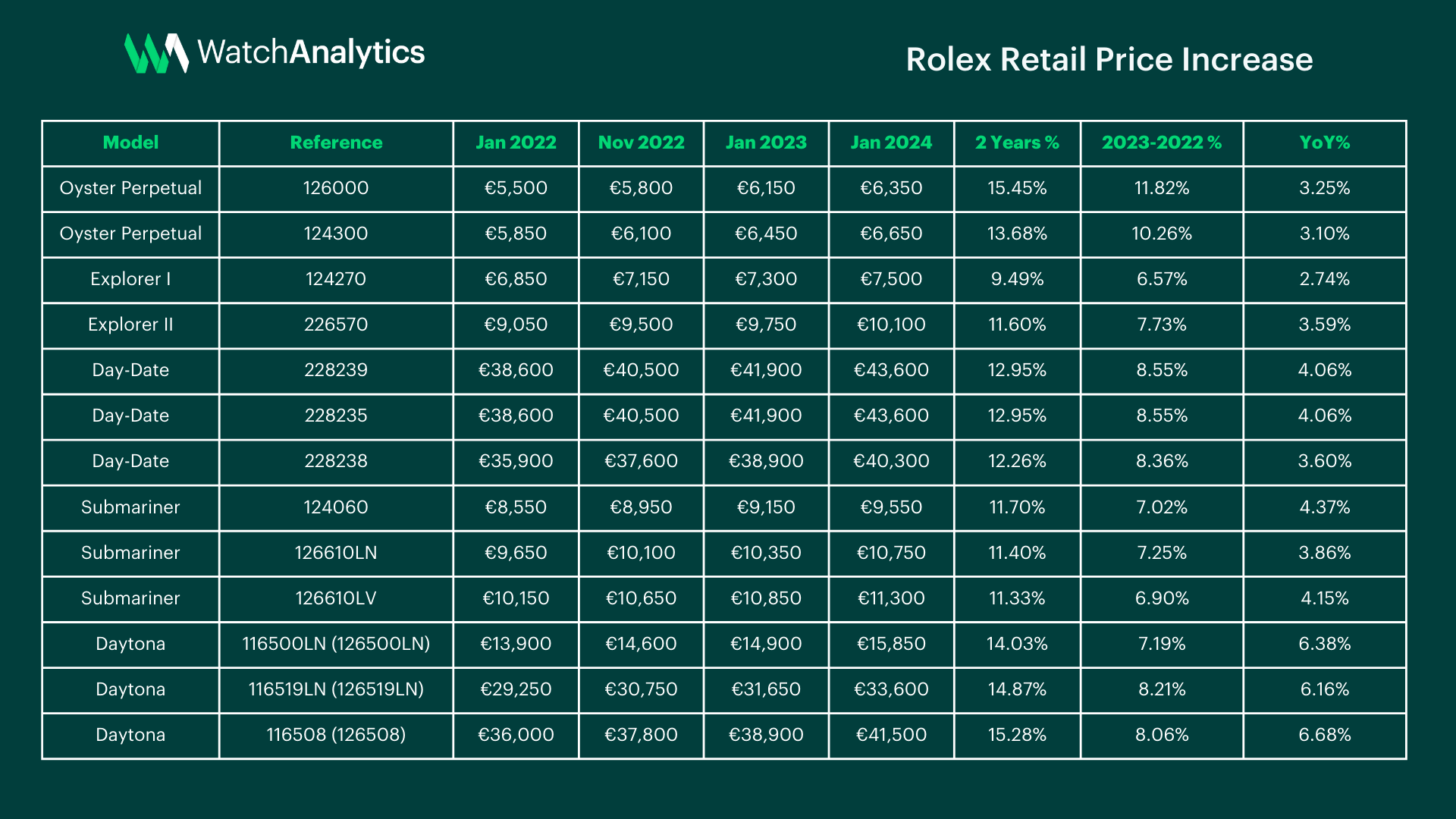 Inflation and changes in raw materials each year lead many maisons to adjust the prices of their watches. In recent years these two components have been very important to the world economy: the end of the pandemic has generated high inflation in both the United States and Europe, while geopolitical tensions have led to a relative increase in the costs of both raw materials and energy. In 2023, thanks in part to the actions of the Central Banks, inflation was reduced, and as a result, list price increases were also lower than those that occurred in January last year. The average 2024 increase was 4% versus 7.8% in 2023, this is about half. Last year's increase was such an exceptional occurrence that Rolex made two increases, in November 2022 and January 2023, so that the increases would be more gradual.